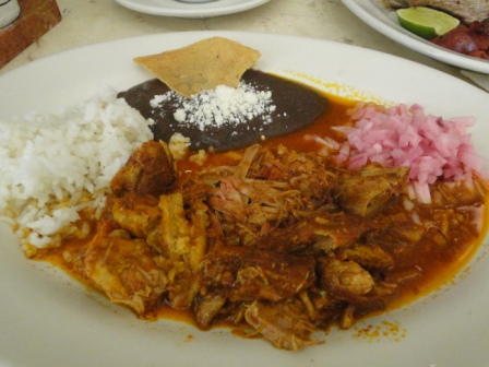 O marido de Poc-Chuc – carne de cervo marinado no suco de laranja, com salada de tomate e cebola roxa, além do feijão preto, uma espécie de clássico mexicano.