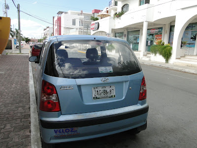 Alugamos um carro para ir a Uxmal, um compacto na Veloz Rent a Car (400 pesos ou R$ 71,00 a diária), com ar condicionado. Estava um pouco velho, a luz interna queimada, não tinha direção hidráulica e a embreagem fazia um barulho estranho, mas nos serviu e muito!