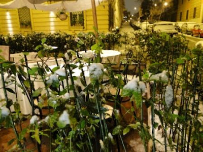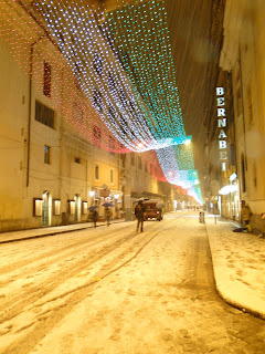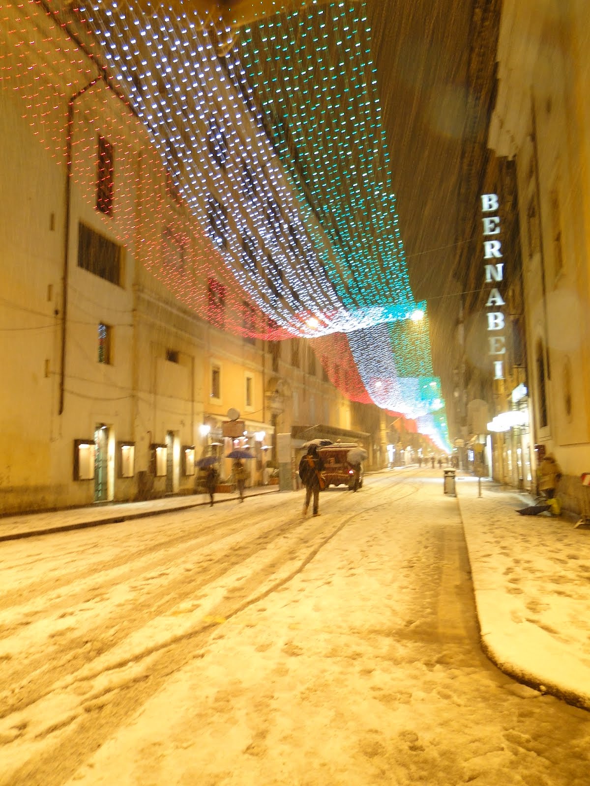 Tentamos seguir para a Praça del Popolo, mas a neve estava muito forte. Voltamos das Igrejas Gêmeas, a Via del Corso estava assim: