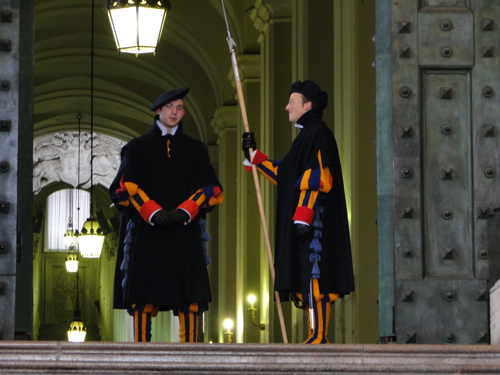 Mas não diminuiu a enorme fila para a Basílica de São Pedro. O mesmo regime de segurança, mas não há ingresso. No caminho, a guarda Suiça fazendo seu trabalho.